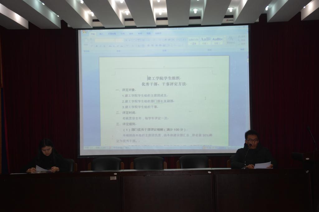 12月16日下午16时45分,建工学院共青团委员会和院学生联合会,组织全体学生干部参加了一次有关建工学院学生组织优秀干部、优秀干事评定方法的大会。大会具体介绍并通过了相关评选的标准和细节。其次,大会宣布了今后各部门有关出勤考核制度,旨在整顿学院学生工作的风气,培养一个有制度、有组织、守纪律的建工学院学生干部群体,促进各成员工作的积极性和凝聚力。