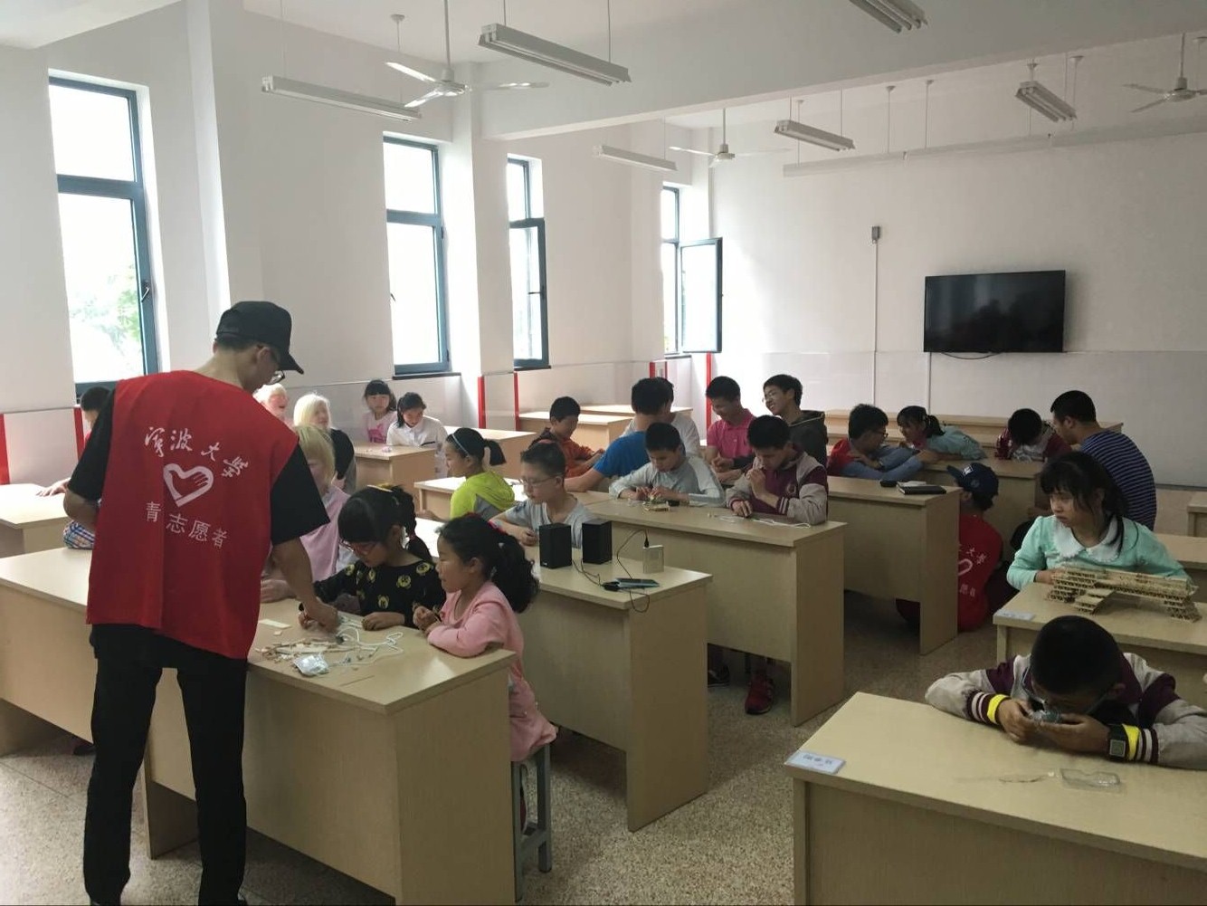 当天下午,志愿者们早早地来到了宁波市特殊教育中心学校,为接下来的活动进行着紧张的布置。活动采取志愿者与盲童一对一对接模式,更好地服务盲童。孩子们兴致勃勃地在志愿者的陪护下用手触摸了建筑模型,志愿者们细心地给孩子们讲解了模型的各个部位的组成和制作的过程,激发了孩子们对于模型的兴趣,感受到了建筑的奇特魅力。