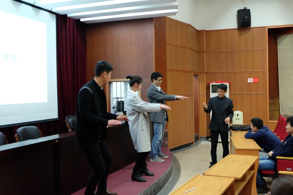 王伟鹏老师首先以中医养生的根本原理开讲,介绍了“阴阳”和“五行”的相关知识。期间以二十四节气为例,对其知识进行了详细的解答。随后王老师分别就情志养生、饮食养生和运动养生三个方面形象生动地阐述中医养生的知识,提出了一些生活中同学们应该注意的不良习惯和解决方法,并告诫同学们应按时睡觉,适时锻炼。王老师还亲身传授了一套“熊经”,同学们都兴致高涨地学习求教。之后,同学们向王老师提出了疑问,王老师也耐心细致地进行解释。最后,讲座在阵阵掌声中落下帷幕。