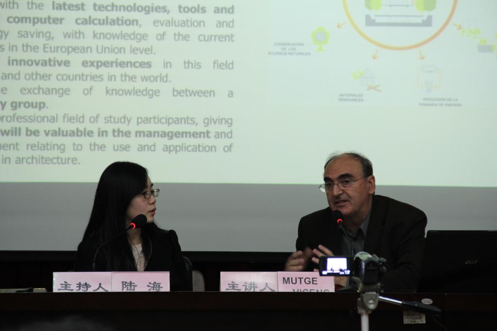 讲座中,MUTGE VICENC首先提出了绿色建筑在中国发展的5大要素:可持续的城市规划、绿色高效节能的建筑、未来建筑设计方面的可行性、更低的建设成本、在艺术与文化方面的可持续发展。之后,MUTGE VICENC以曾经设计过的住宅、写字楼为例,介绍了绿色高效节能的建筑方案。