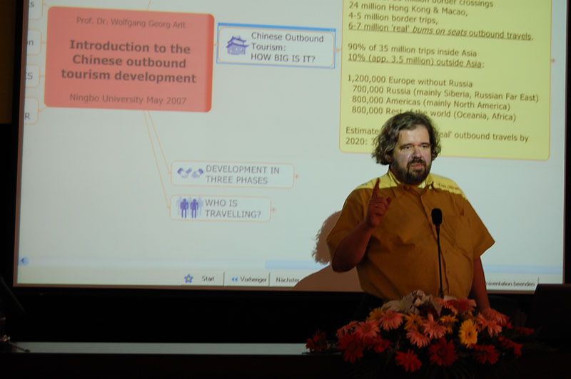 师生们进行了一场生动有趣、别开生面的报告。在报告中,他首先从国际视野出发,以最新旅游统计数据和抽样调查为基础,描述了中国出境旅游的地域和阶段特征。深层次分析了中国游客在不同文化情境下的旅游行为、中国游客赴欧旅游的动机和不同游客群体、中国和欧洲游客之间的知识鸿沟以及跨文化差异等。最后,阿尔特教授从国际旅游发展的态势以及针对目前中国出境旅游中存在的问题,提出中国出境旅游组织面临的挑战、任务以及旅游产品的营销战略。报告结束后,师生们积极踊跃地用英语提出各种专业性问题,阿尔特教授通过具体的案例给予了解答。