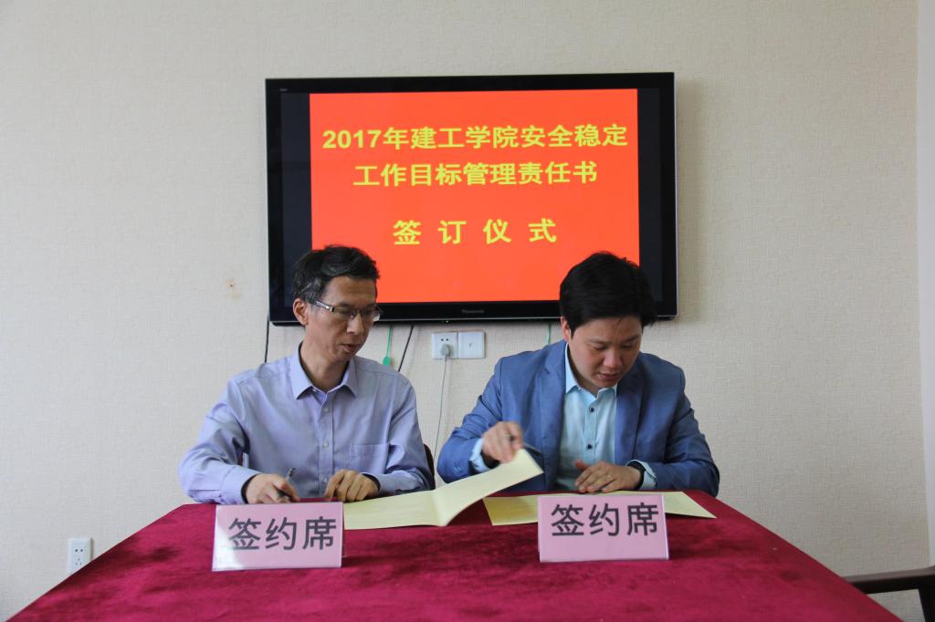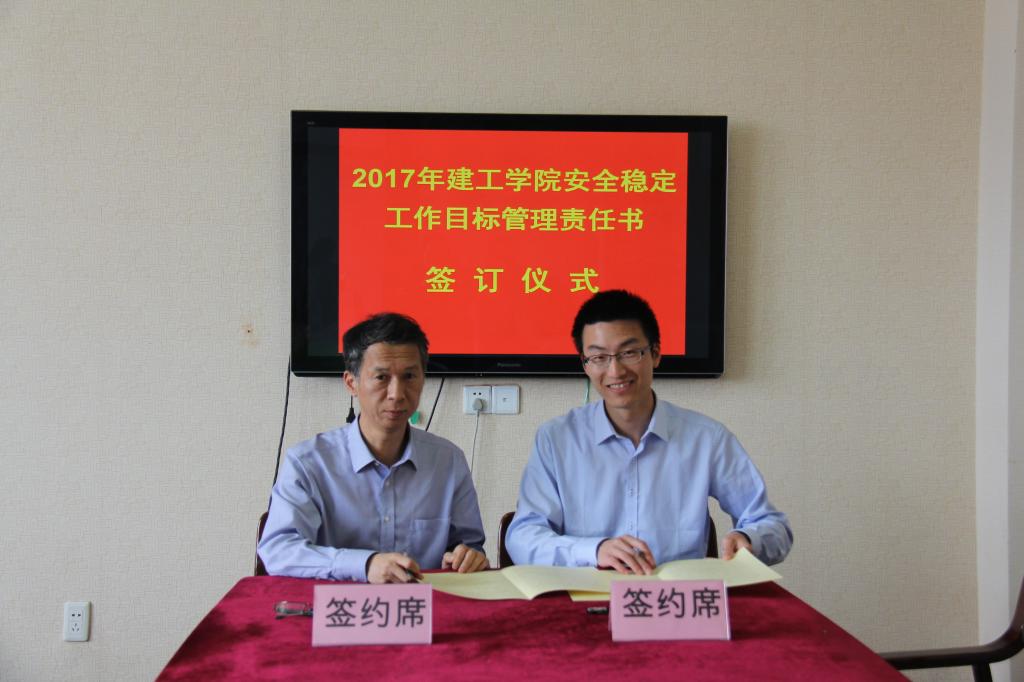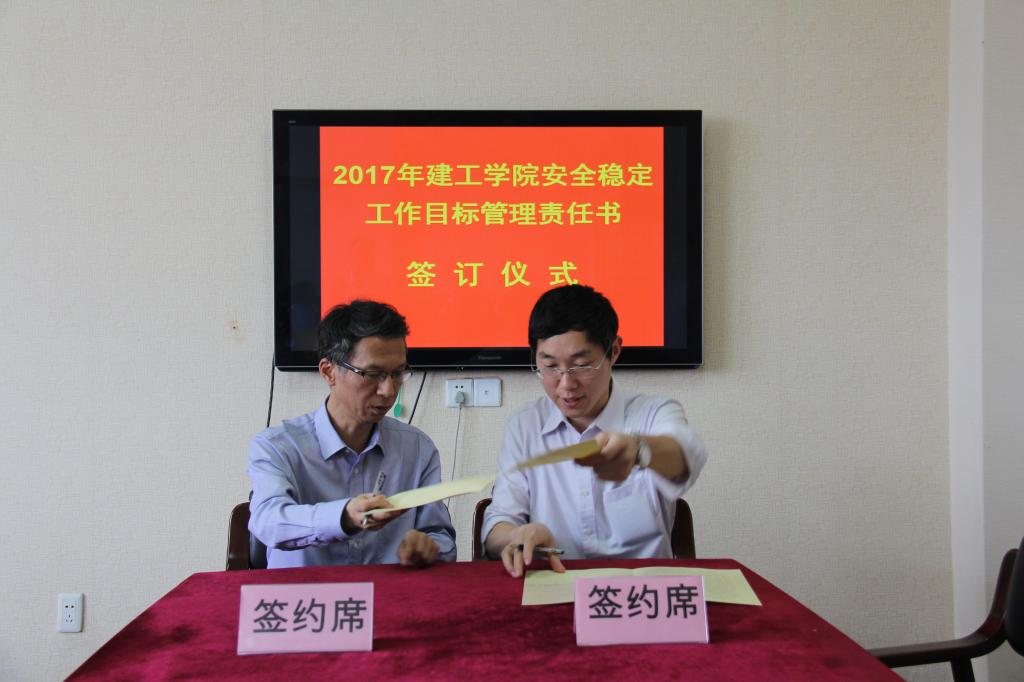 5月8日下午,sex8 安全稳定工作目标管理责任书签订仪式在学院303会议室举行。会上,学院安全稳定工作责任人郑荣跃院长分别与各个基层学术组织系/所负责人签订了《2017年建工学院安全稳定工作目标管理责任书》。