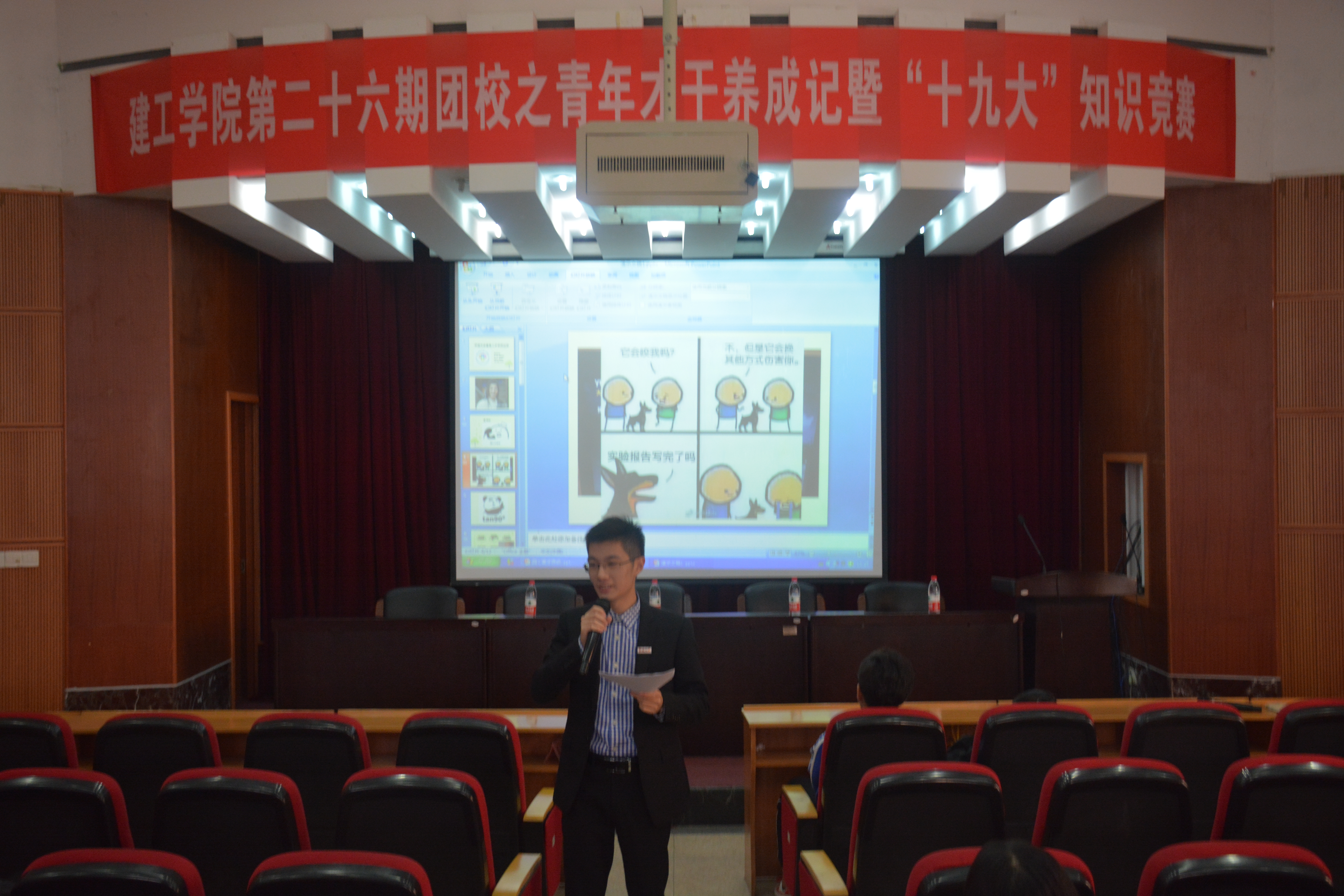 11月4日14:30分 sex8 建筑工程与环境学院第二十六期团校第三讲——政宣部十九大知识竞赛在建工学院报告厅举行。此次知识竞赛由建工学院团委政宣部部长童蝶宏主讲,建工学院团委、学联等几十位团校学员到场参加此次知识竞赛。