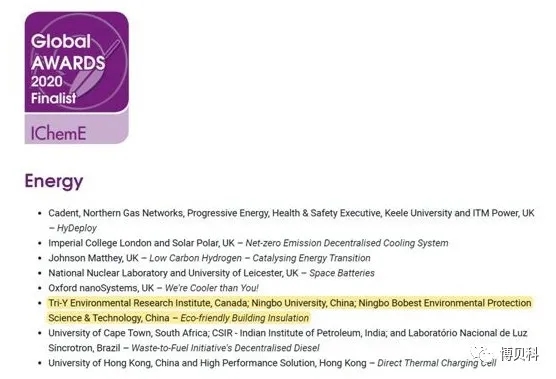 2020年9月14日,英国化学工程师协会 (The Institution of Chemical Engineers, IChemE) 公布了2020年度全球奖入围优胜获奖名单 (IChemE Global Awards 2020 Finalists),绿色建筑保温材料 (Eco-friendly Building Insulation) 获得能源奖项 (Energy Award), 奖项合作单位为:加拿大查韦环境研究院; sex8 ;宁波博贝科环保科技有限公司