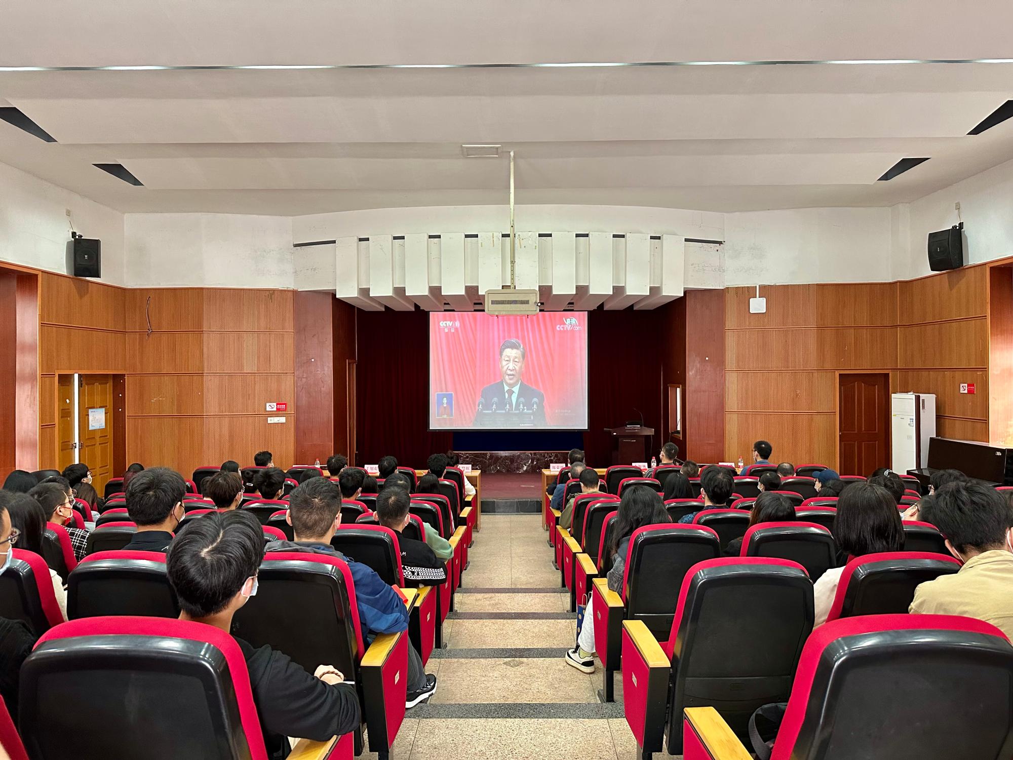 当雄壮的国歌声在人民大会堂奏响时, sex8 一楼报告厅也一片庄严,学院党政领导班子成员、各师生党支部委员、师生代表等集聚在一起,怀着无比激动的心情共同收看了大会实况直播,认真聆听、学习了习近平总书记代表第十九届中央委员会所作的报告,喜迎盛会的胜利召开。