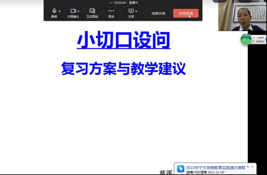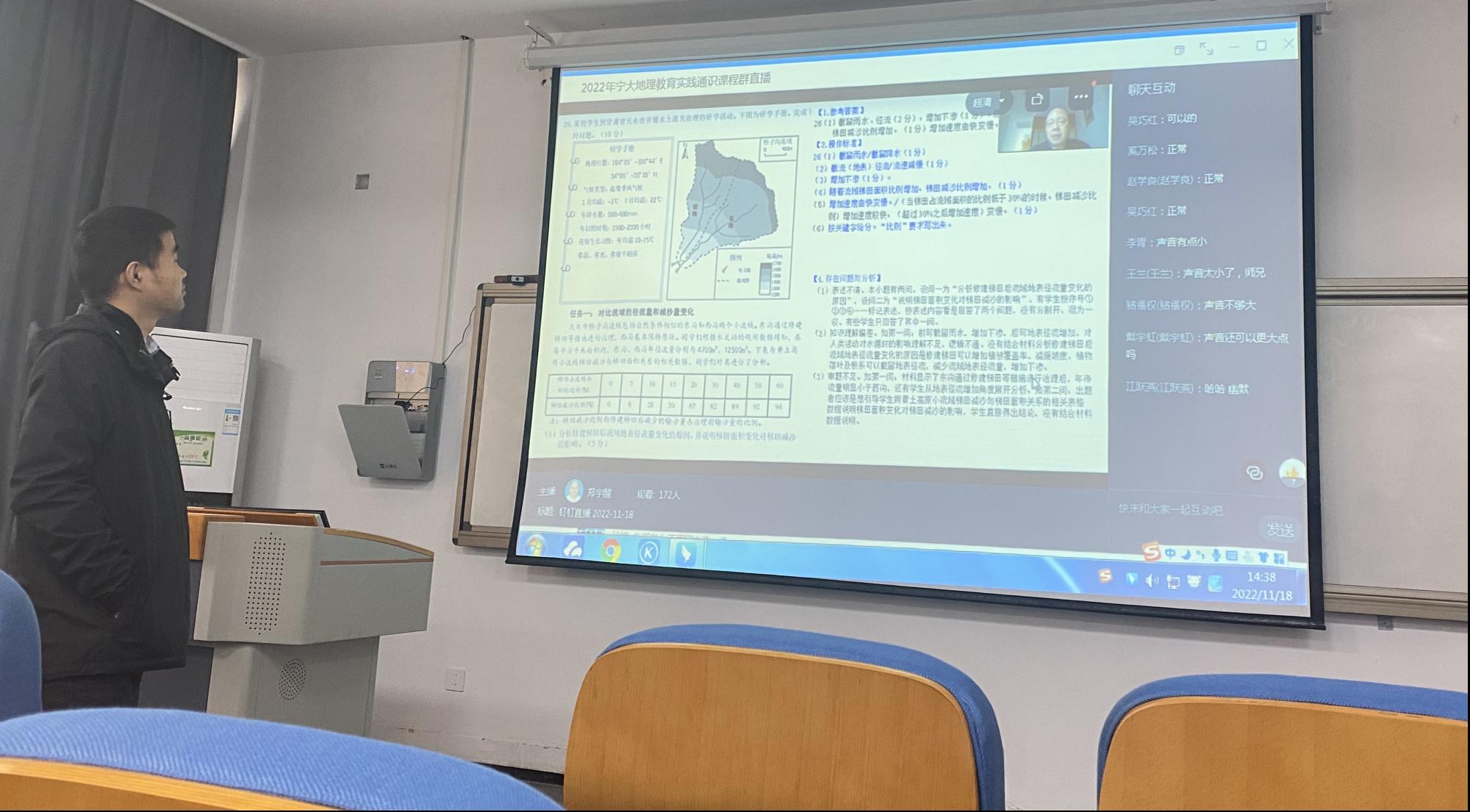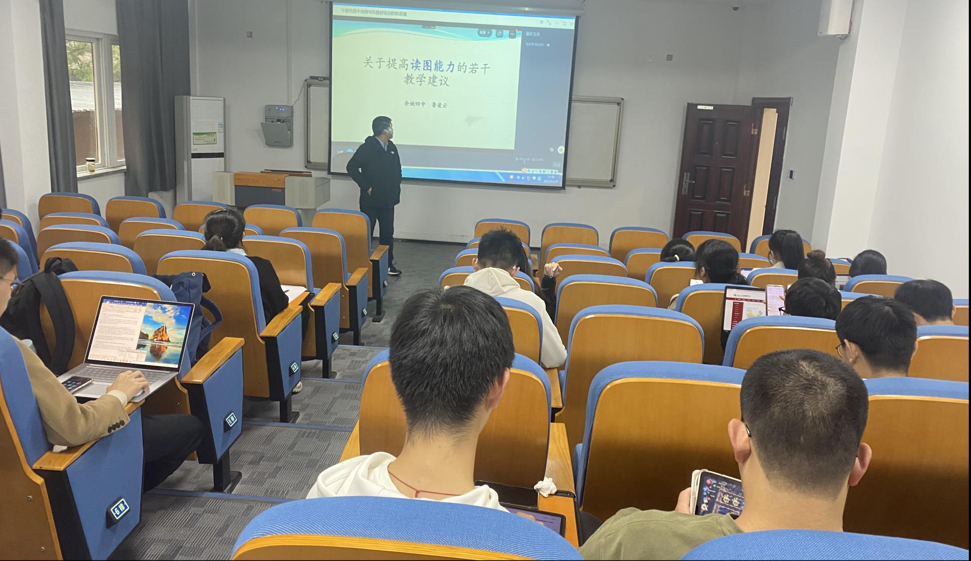 2022年11月18日,宁波市2022年秋季高中地理双新教研活动顺利开展。 sex8 师范生在载物楼202教室全程参与市级教研活动。上午9:00-10:30徐皓老师和郑宇醒老师共同组织了《从格局-过程-机制视角提升地理问题解决能力——以“水—沙相互作用”为例》的线上听课活动和《从格局-过程-机制视角提升地理问题解决能力的课堂教学》的线上评课活动,下午14:00-16:00开展了《市地理选考模拟考试情况反馈》、《小切口设问复习方案与教学建议》、《关于提高读图能力的若干教学建议》这三场教研活动。观摩学习本次活动的同学主要为2020级地理科学(师范)全体本科生及部分线上听课的地理科学(师范)本科生。
