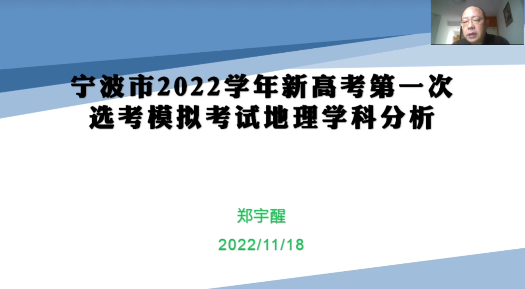 下午的第一场教研活动由宁波市教研员郑宇醒老师主讲,对宁波市2022学年新高考第一次选考模拟考试地理学科进行透彻详实地分析。先对宁波市一模的考试结果进行总体分析,再对试题答题情况进行详细分析。不光解析说明常见易错题,还从命题人的角度介绍考题的背景知识,带领同学们转换视角,更加深入了解地理选考卷的命题思路。