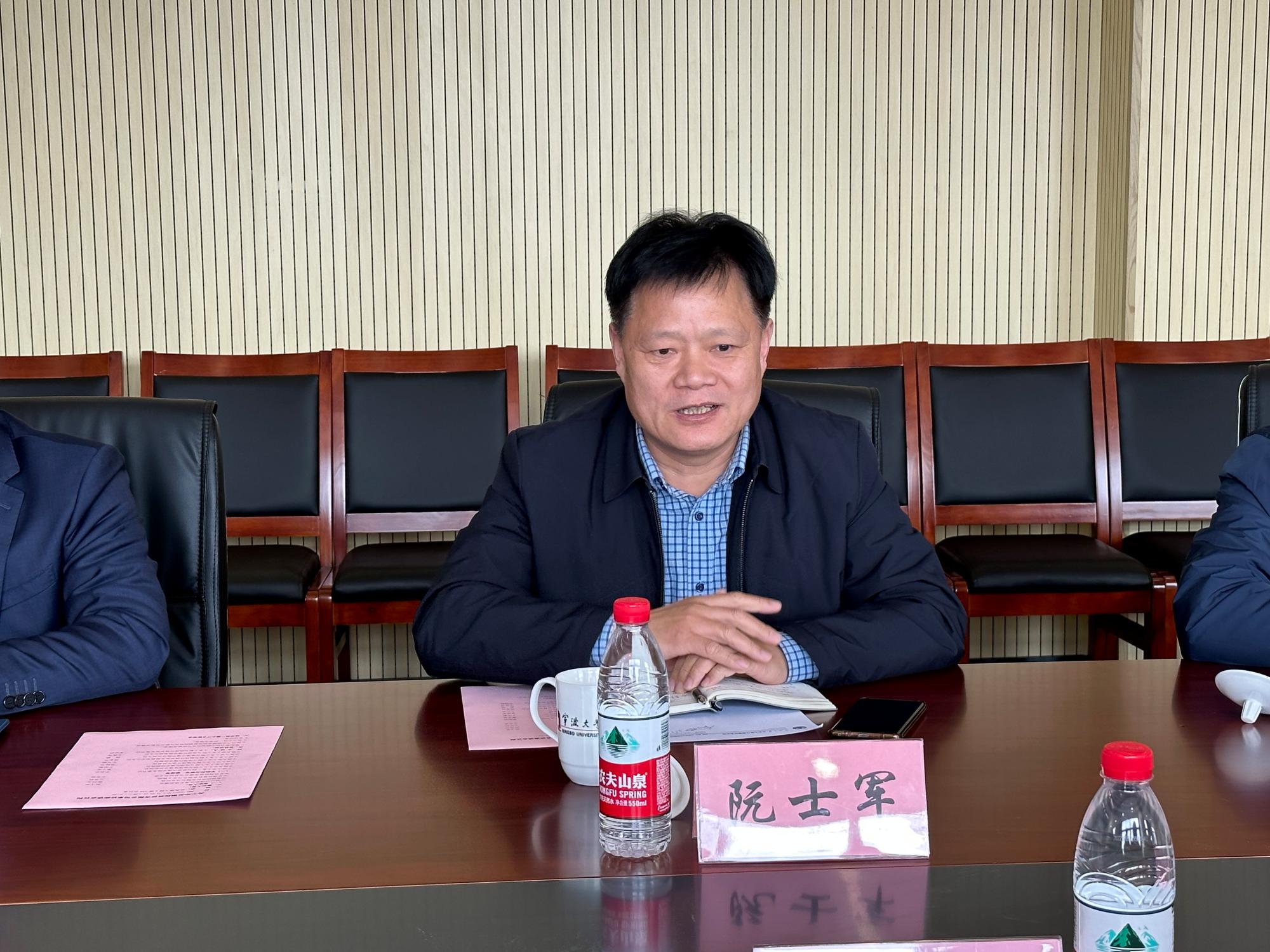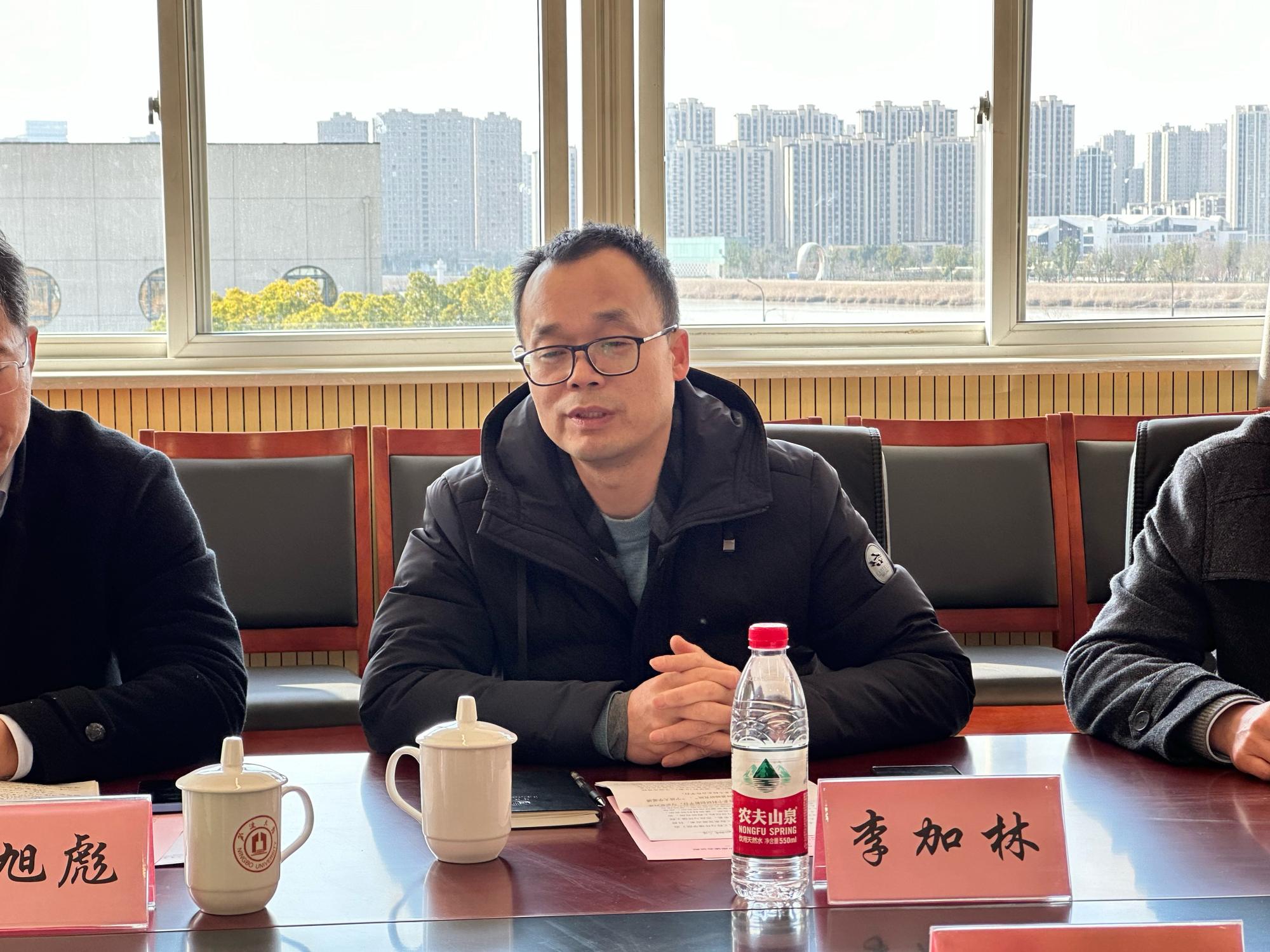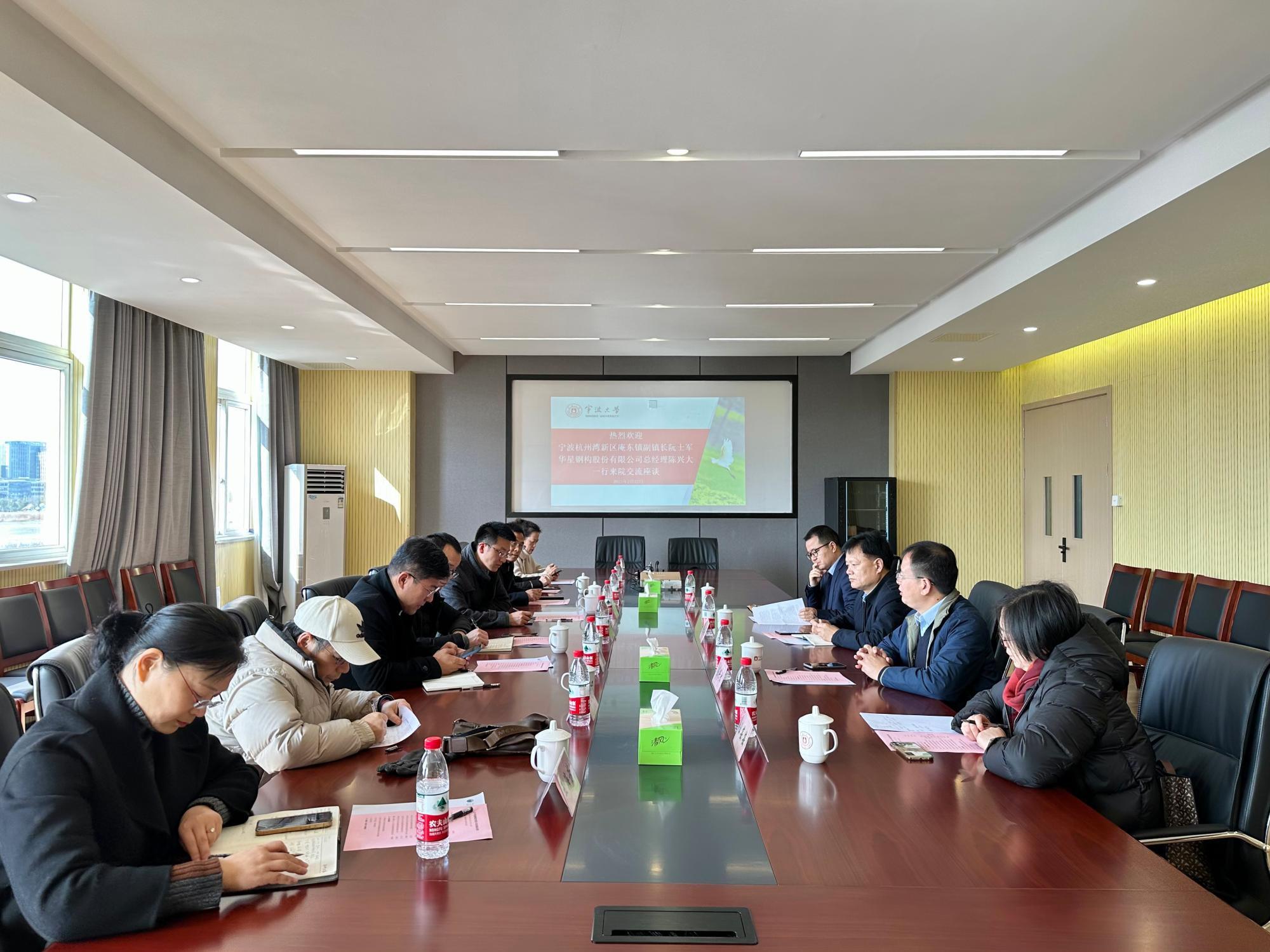 院党委书记李加林对宁波杭州湾新区庵东镇副镇长阮士军、华星钢构股份有限公司总经理陈兴大一行的到来表示诚挚的欢迎。李加林介绍了学院历史沿革、科研创新平台、学科建设、人才培养、师资力量、党建工作等情况,表示双方可以在技术合作、人才培养、成果产出以及教育培训等方面增进了解,加强合作。