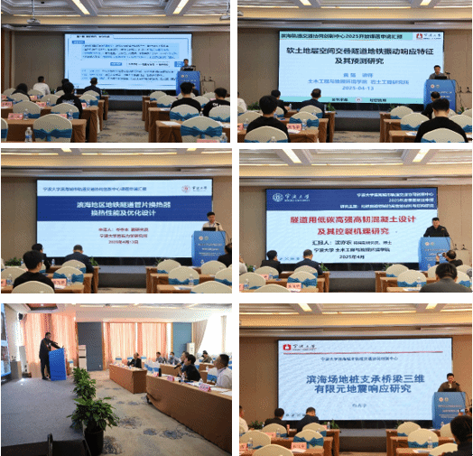 下午专题研讨环节紧扣"滨海地铁隧道与桩基工程"主题推进。盛涛副教授系统阐释《滨海地铁上盖振震双控支座研发与设计理论》,黄强博士深度解析《软土地层空间交叠隧道地铁振动响应特征及其预测研究》,岑夺丰副研究员作了题为《滨海地区地铁隧道管片换热器换热性能及优化设计》的报告,沈亦农博士介绍了《隧道用低碳高强高韧混凝土设计及其控裂机理》,齐昌广副教授作了题为《滨海地区高聚物注浆再生骨料桩的工作性能研究》的报告,布占宇教授团队围绕《滨海场地桩支承桥梁三维有限元地震响应研究》进行汇报。由宁波中淳高科股份有限公司副总裁张日红教授领衔的专家团队,从研究背景意义、理论创新性、工程适用性等维度对各报告进行了专业点评与指导,为其后续深化研究提出了宝贵建议。