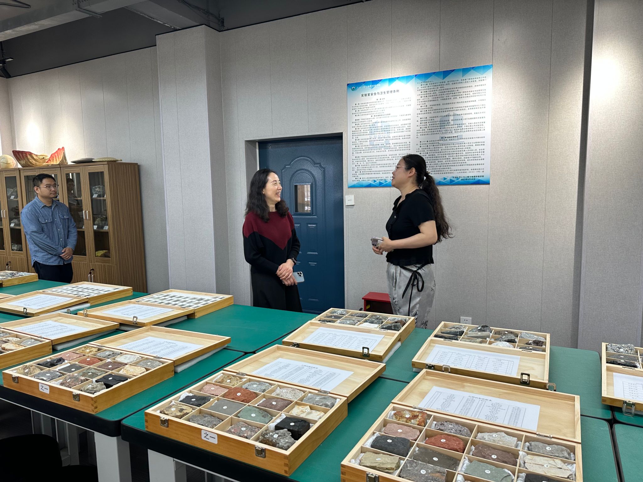 座谈会后,余雪华一行实地考察了位于西区载物楼的岩矿标本馆(科普基地),听取了基地在青少年科普教育、实践课程开发及志愿服务等方面的工作介绍。该基地是浙江省地理学会科普教育基地、宁波市科普基地,近年来面向大中小学生开展地理科普教育等活动,成为学院关工委融入社会服务的特色平台。