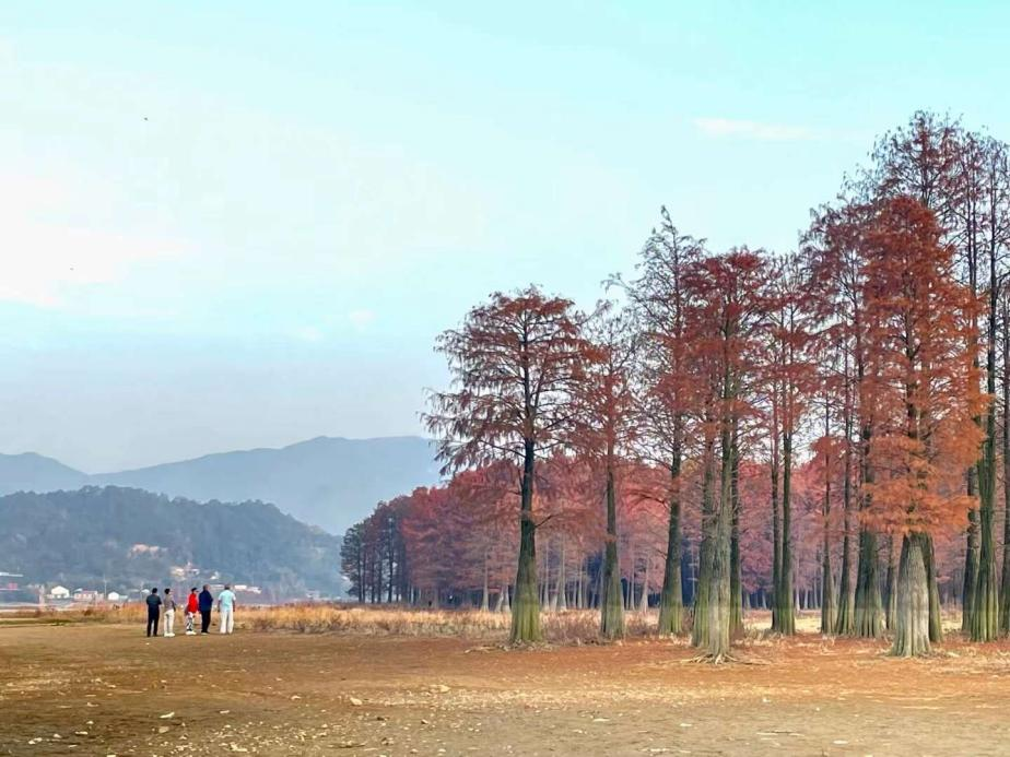 本次活动的最后一站是四明湖水杉林。水杉林位于四明湖的西南侧。入冬时节,这湖畔的水杉仿佛是大自然打翻的颜料盘,嫣红一片,美得让人心醉。“潦水尽而寒潭清,烟光凝而暮山紫。”群山连绵,水天一色。在这苍茫天地之间,水杉娉婷而立,火焰般的针叶如同天边簇簇云霞,温暖着每个人的心。师生在此稍作观光游憩,将本次活动推到了尾声。