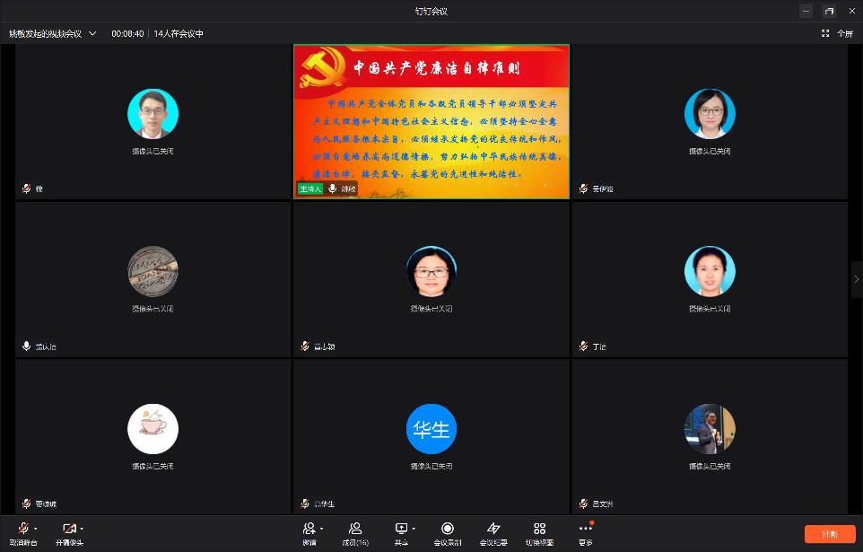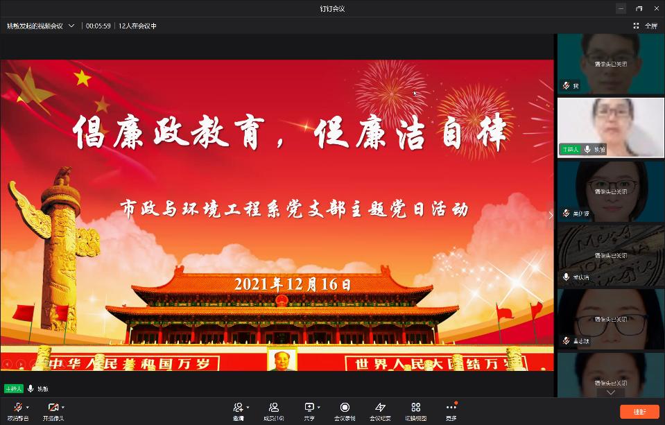 2021年是中国共产党成立100周年,建党百年,新的起点,新的征程。为深入推进党风廉政建设,进一步引导广大党员旗帜鲜明讲政治,增强纪律观念、强化纪律执行,共同营造风清气正的良好政治生态,市政与环境工程系党支部在全市共同抗击新冠疫情的特殊时期,利用钉钉线上会议,组织支部全体党员于2021年12月16日晚开展“倡廉政教育,促廉洁自律”的主题党日活动。
