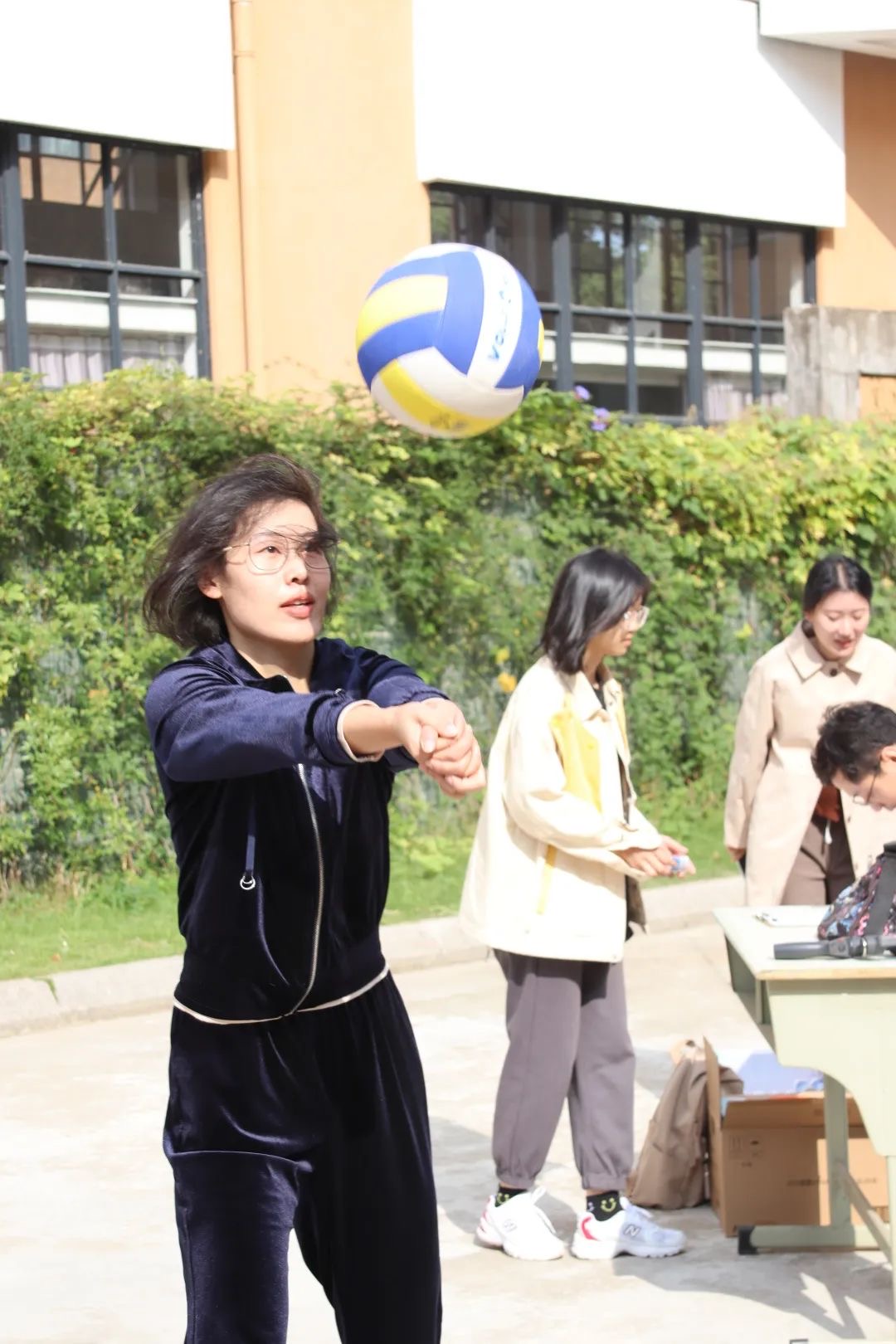 “321,开始!”随着裁判的一声令响,老师们拿起气排球往空中一抛,开始用双手垫气排球,一分钟内,谁垫球的次数最多,谁就能够获得最终的胜利。