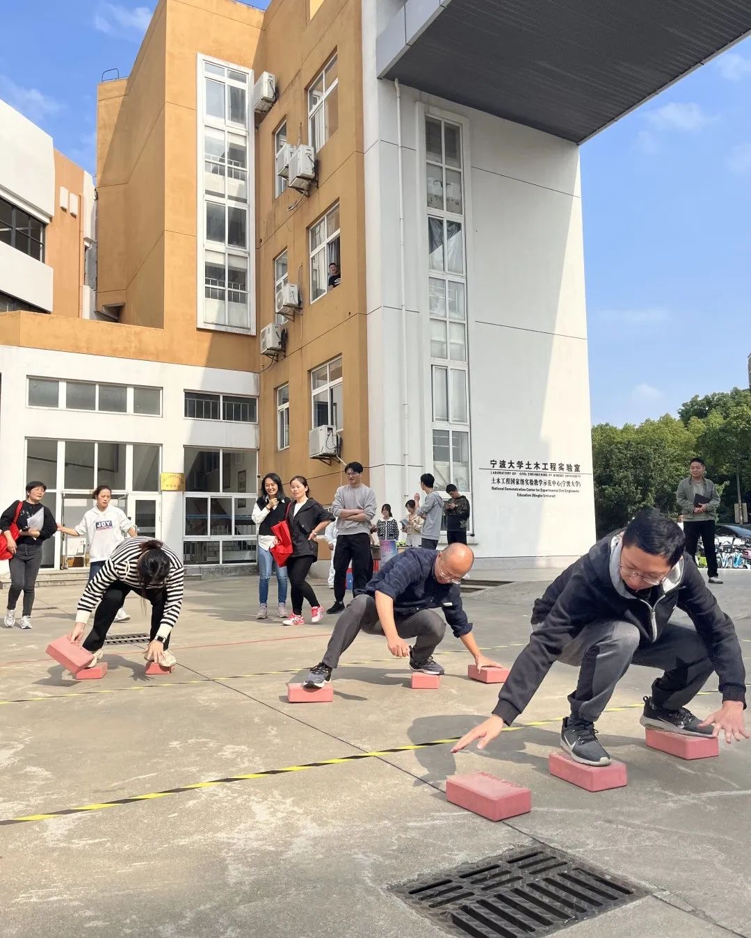 在摸石过河比赛场地,教师们双手灵活地挪动“砖头”,“凌波微步式”向前移动,展现了绝佳的身体协调能力与灵活度。