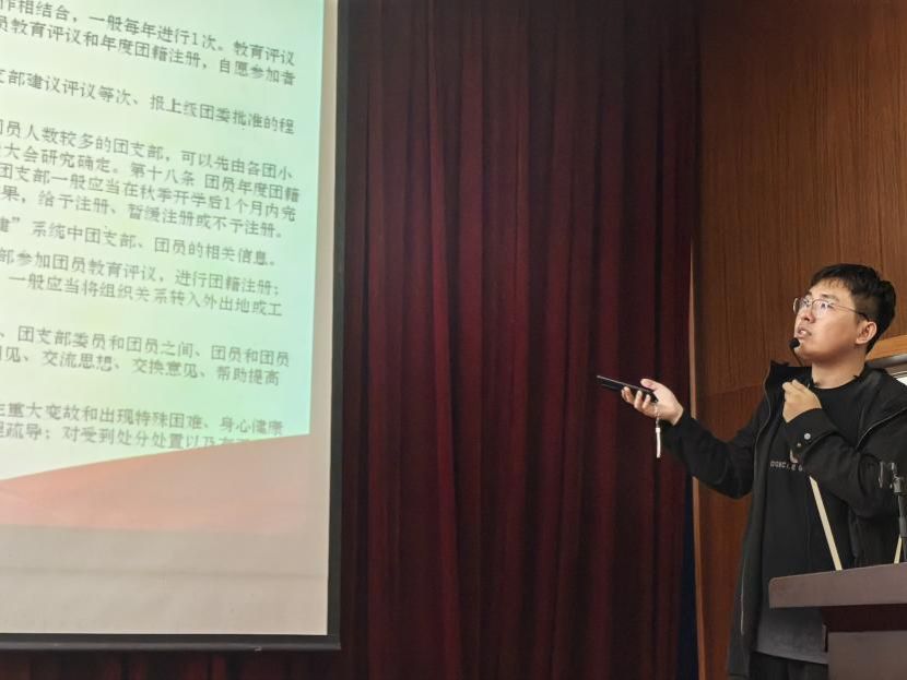 本次主题团课围绕团支部规范性建设及活动开展的要求、《中国共产主义青年团支部工作条例(试行)》具体内容和“三会两制一课”具体要求开展,对如何规范操作智慧团建系统以及在书写入团申请书和志愿书的过程中需要注意的问题进行了讲解。同时对新生团支部的建设提出了切实有效的建议,呼吁所有团员能够充分发挥主观能动性。