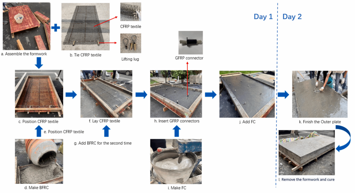 装配式夹芯保温墙板是一种集承重、保温功能于一体的墙体结构,由内叶板、外叶板、保温材料层及连接件组成,连接件类型、页板材料以及夹芯材料均会影响墙板的极限承载力和延性。基于此,为推进建筑节能减排,促进装配式保温墙板在建筑结构中的应用,本研究设计一种绿色节能的装配式墙板,采用再生骨料和竹原纤维为原料配制竹原纤维再生骨料混凝土作为墙板的结构层材料,采用主要组分是海砂和大掺量粉煤灰的自研泡沫混凝土作为保温材料,结合玻璃纤维增强聚合物连接件、碳纤维网格布,对墙板构造形式及尺寸进行设计。本研究对墙板进行了静力受弯试验,获得了试件的破坏形态、承载力及裂缝扩展模式;基于混凝土CDP模型和Cohesive接触方法,采用ABAQUS有限元软件建立了三维模型,分析了墙板的破坏模式与累积损伤破坏过程;通过对竹原纤维再生骨料混凝土装配式保温夹心墙板进行抗弯承载力理论计算,并和试验结果进行对比,验证了修正后理论计算公式的准确性。研究结果表明:墙板的抗弯承载力在30~40 kN之间,达到规范规定限值的2~3倍,墙板极限荷载与屈服荷载的比值均在1.45以上,说明墙板有一定的承载力安全储备;墙板的延性系数在8~10之间,具有良好的延性特征。相关研究成果发表在国际结构工程领域顶级期刊《Engineering Structures》(SCI, JCR Q1,中科院1区, TOP, IF = 5.6)。