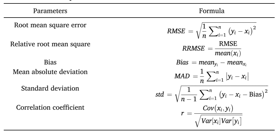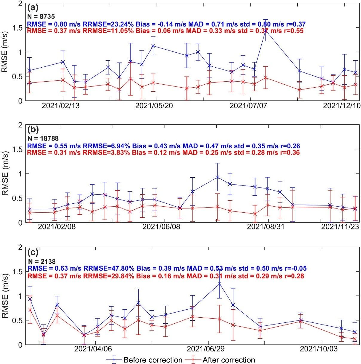 验证指标:RMSE、Bias、MAD、标准差、相关系数 r、相对 RMSE(RRMSE)等。并通过散点图与1:1参考线、误差随入射角/航向/风速的分布图来分析残差来源。
