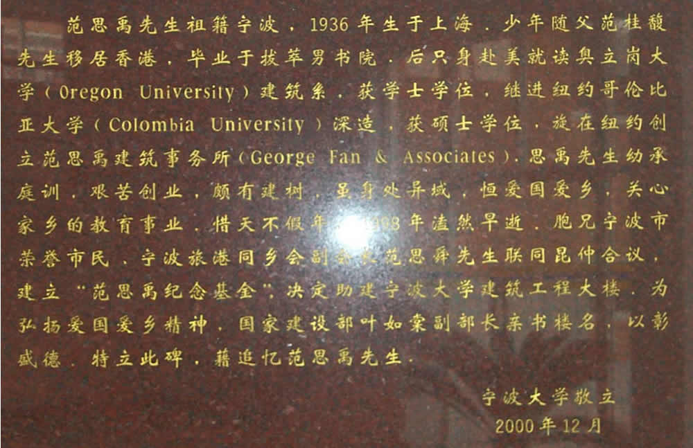 范思禹先生祖籍宁波,1936 年生于上海,少年随父范桂馥先生移居香港,毕业于拔萃男书院,后只身赴美就读奥立岗大学 (Oregon University)建筑系,获学士学位,继进纽约哥伦比亚大学 (Colombia Universitv ) 深造,获硕士学位,旋在纽约创立范思禹建筑事务所(George Fan & Associales )。思禹先生幼承庭训,艰苦创业,颇有建树,虽身处异域,恒爱国爱乡。关心家乡的教育事业、惜天不假年,1998年溘然早逝。胞兄宁波市荣誉市民,宁波旅港同乡会副会长范思舜先生联同昆仲合议,建立“范思禹纪念基金”,决定助建 sex8 建筑工程大楼,为弘扬爱国爱乡精神,国家建设部叶如棠副部长亲书楼名,以彰盛德。特立此碑,藉追忆范思禹先生。